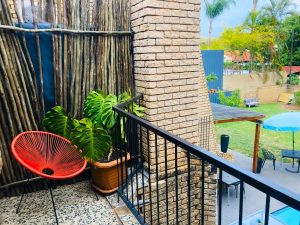 This roomtype is located on the first floor, but take note that only room 3 and 4 are on the same side of the property, using a staircase shared with room 5, while room 6 is located on the other side of the property, sharing the staircase with room 7. Guests who therefore book these 3 rooms together must note that they are not close together. The stairs to rooms 3 and 4 are near room 1 and 2’s entrances, while room 6’s staircase are beside the reception to the front of the property. All rooms are within easy access of the reception, restaurant and swimming pool. If you book additional rooms that are in other room categories, note that they are not always available close together.